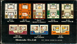 --- Silver Serie --- BALL (AC-01) FLAGMAN (FL-02) VERMIN (MT-03) FIRE (RC-04) JUDGE GREEN (IP-05) JUDGE PURPLE (IP-05) --- Gold Serie --- MANHOLE (MH-06) HELMET (CN-07) LION (LN-08) --- Wide Screen Serie --- PARACHUTE (PR-21) OCTOPUS (OC-22) POPEYE (PP-23) CHEF (FP-24) MICKEY MOUSE (MC-25) EGG (EG-26) FIRE (FR-27) TURTLE BRIDGE (TL-28) FIRE ATTACK (ID-29) SNOOPY TENNIS (SP-30) --- Multi Screen Serie --- OIL PANIC (OP-51) DONKEY KONG (DK-52) MICKEY & DONALD (DM-53) GREEN HOUSE (GH-54) DONKEY KONG II (JR-55) MARIO BROS. (MW-56) RAIN SHOWER (LP-57) LIFE BOAT (TC-58) PINBALL (PB-59) BLACK JACK (BJ-60) SQUISH (MG-61) BOMB SWEEPER (BD-62) SAFE BUSTER (JB-63) GOLD CLIFF (MV-64) ZELDA (ZL-65) --- Table Top Serie --- DONKEY KONG JR. (CJ-71) MARIO'S CEMENT FACTORY (CM-72) SNOOPY (SM-73) POPEYE (PG-74) --- Panorama Serie --- SNOOPY (SM-91) POPEYE (PG-92) DONKEY KONG JR. (CJ-93) MARIO'S BOMBS AWAY (TB-94) MICKEY MOUSE (DC-95) DONKEY KONG CIRCUS (MK-96) --- New Wide Screen Serie --- DONKEY KONG JR. (DJ-101) MARIO'S CEMENT FACTORY (ML-102) MANHOLE (NH-103) TROPICAL FISH (TF-104) SUPER MARIO BROS. (YM-105) CLIMBER (DR-106) BALLOON FIGHT (BF-107) MARIO THE JUGGLER (MB-108) --- Super Color Serie --- SPITBALL SPARKY (BU-201) CRABGRAB (UD-202) --- Micro vs. System Serie --- BOXING/PUNCH OUT (BX-301) DONKEY KONG 3 (AK-302) DONKEY KONG HOCKEY (HK-303) --- Crystal Screen Serie --- SUPER MARIO BROS. (YM-801) CLIMBER (DR-802) BALLOON FIGHT (BF-803) --- Spezial Serie --- SUPER MARIO BROS. (YM-901)