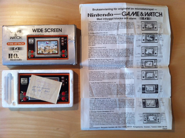 Once more a Game&Watch rarity was discovered. A Fire Attack ID-29 from Sweden that has an additional special imprint on the box: HO. This is similar to the games from France with the J.i21 logo imprinted.The HO. stands for Henrik Oskarson, this name is imprinted on the box as well. On the backside of the manual you can see the name of a company called Bergsala Handels AB. Probably this was the general importer of the G&W games. It's unknown why the name Henrik Oskarson is imprinted on the box.
